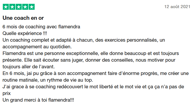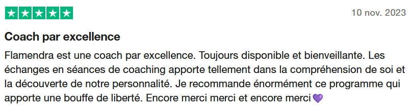 "Flamendra est une coach par excellence. Les échanges en séances de coaching apportent tellement dans la compréhension de soi et la découverte de notre personnalité.