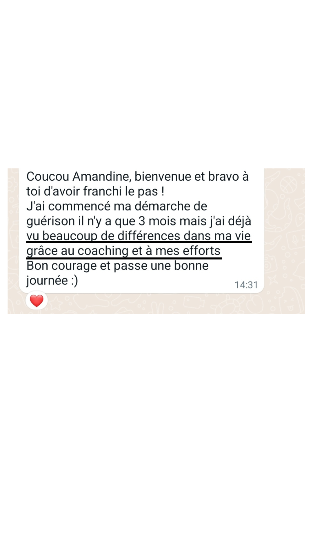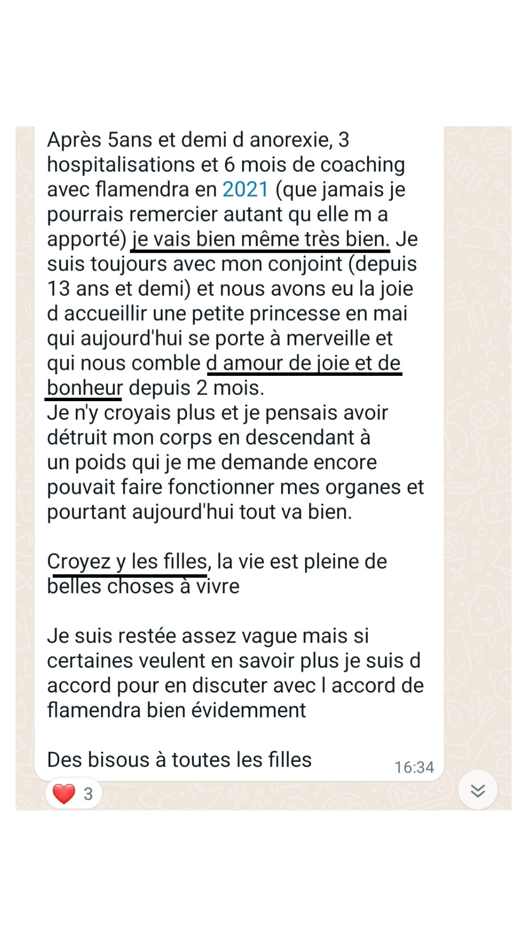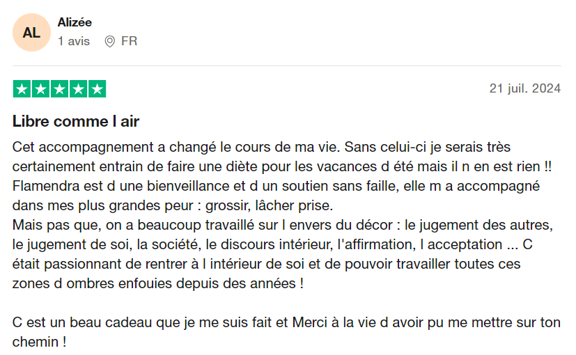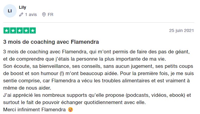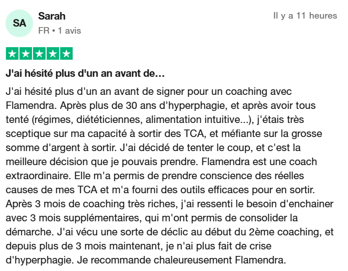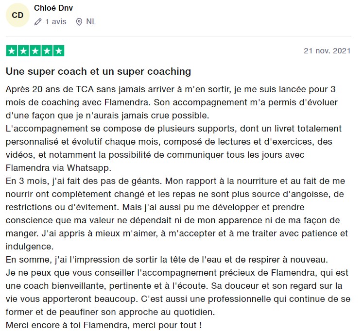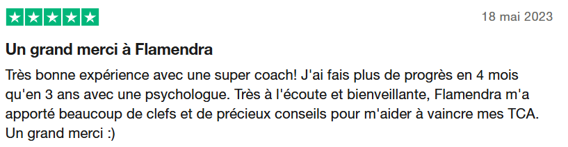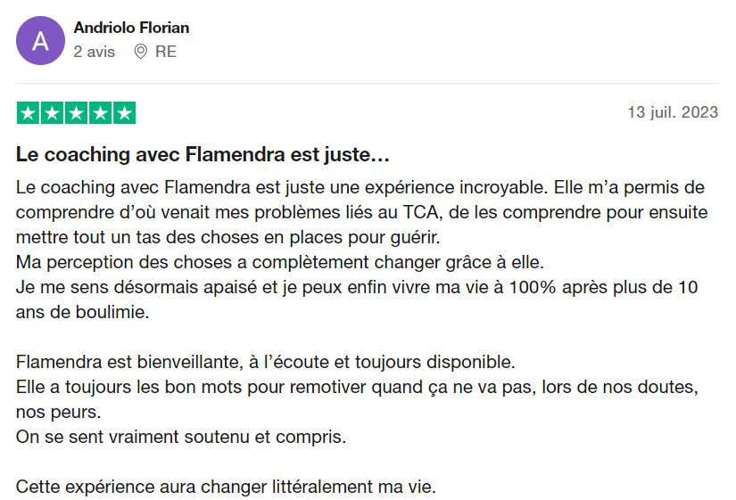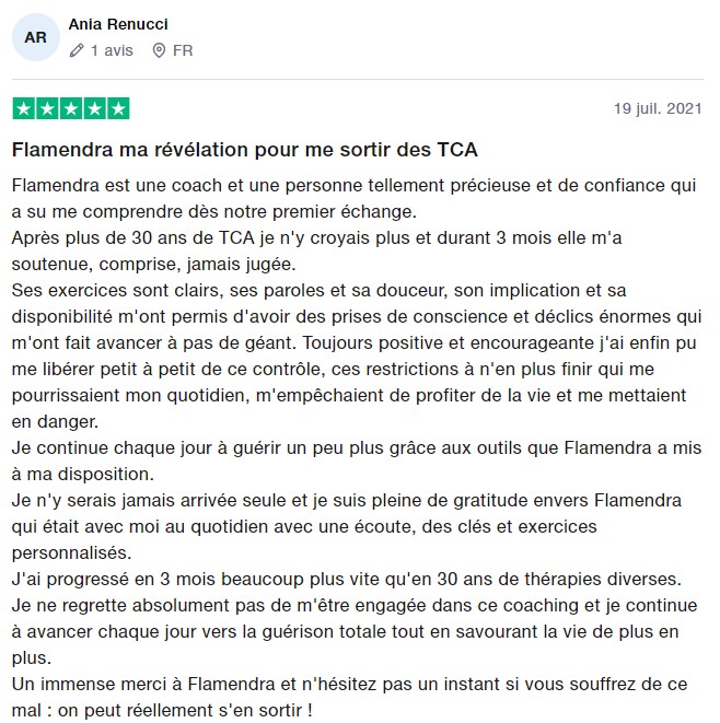 "Le coaching avec Flamendra est juste une expérience incroyable. Elle m'a permis de comprendre d'où venait mes problèmes liés aux TCA pour ensuite mettre tout un tas de choses en place pour guérir.