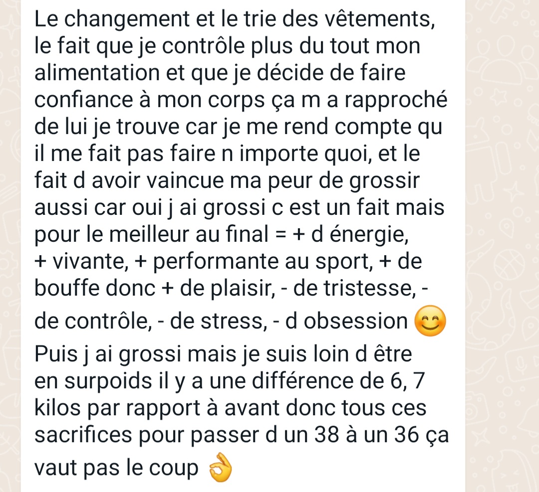 Son programme est juste incroyable, j'ai eu tellement de déclic et grâce à elle je suis en train de retrouver la joie de vivre, le bonheur, la simplicité des choses et surtout, une belle relation avec mon corps et la nourriture."