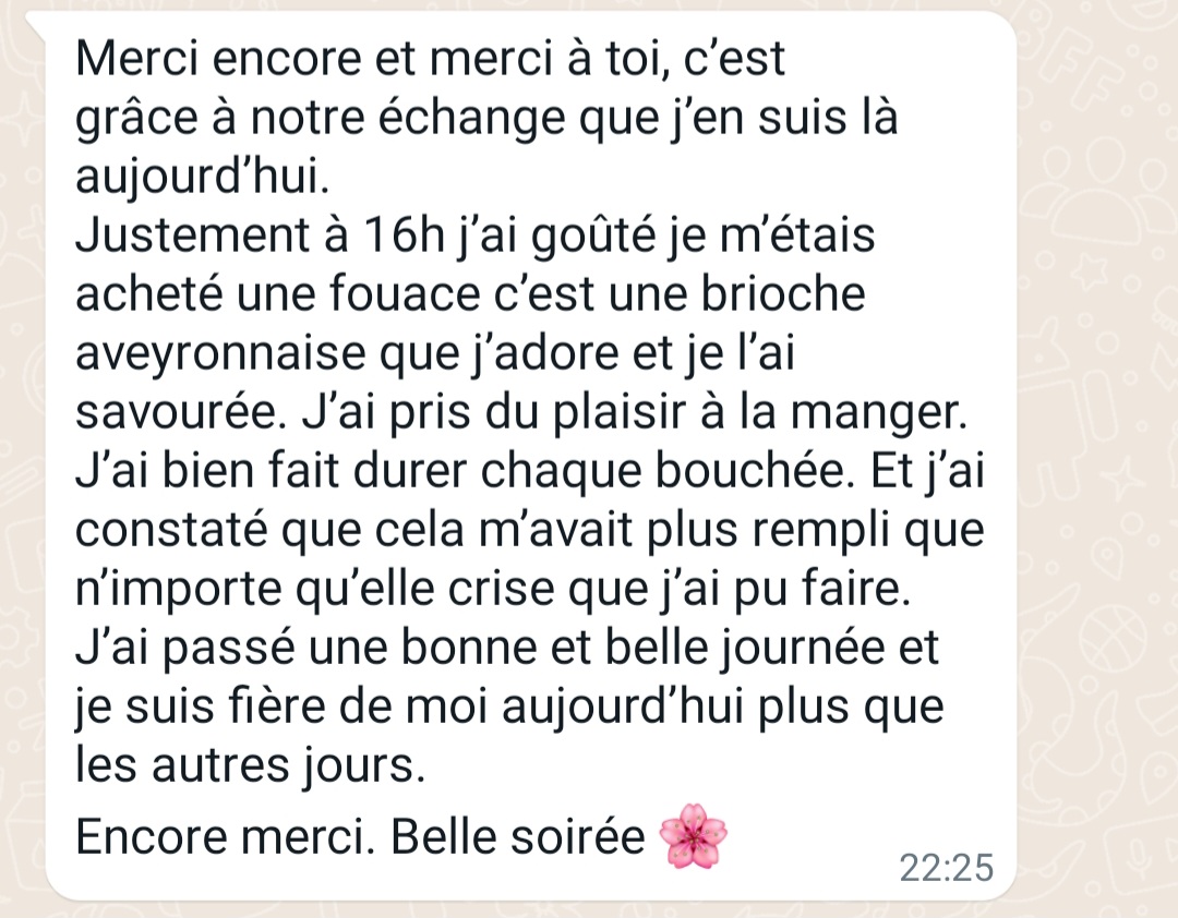 "Depuis plus de 3 mois maintenant, je n'ai plus aucune crise d'hyperphagie.