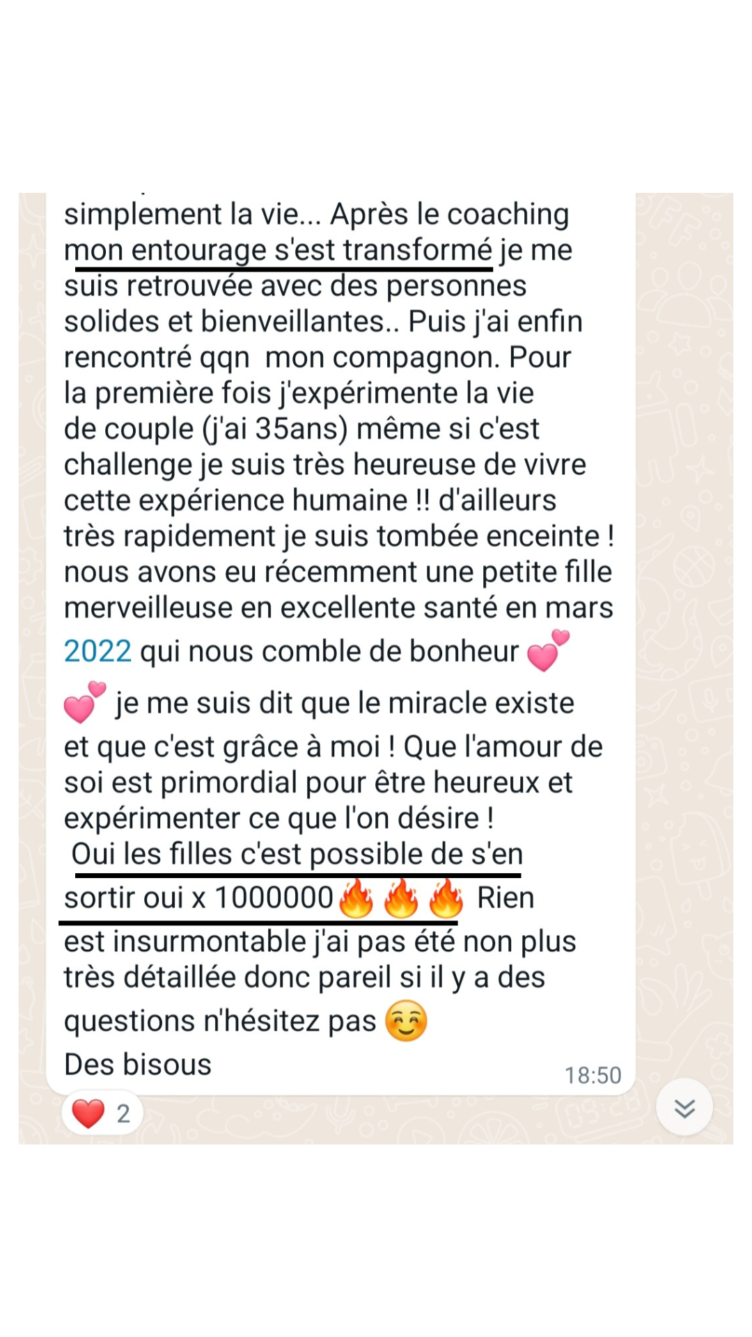 ✓ La possibilité de contacter Flamendra en illimité via What’s App (messages écrits et vocaux) entre chaque séance